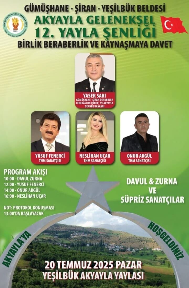 Etkinliğin ev sahipliğini Gümüşhane-Şiran Dernekler Federasyonu (ŞİDEF) ve Akyayla Derneği Başkanı Yaser Sarı üstleniyor. Başkan Sarı, şenliğin amacını şu sözlerle ifade etti: “Gümüşhane Şiran Yeşilbük Akyayla Derneği olarak düzenlediğimiz 12. Geleneksel Yayla Şenliğimizin temel amacı, sıla-i rahim yapmak, kültürümüzü, geleneğimizi ve göreneklerimizi yaşatmak, ayrıca memleketini ve köyünü tanımayan gençlerin köylerini ziyaret etmelerini, tanışmalarını ve kaynaşmalarını sağlamaktır. Bu etkinliği birlik, beraberlik ve kardeşlik adına düzenliyoruz.” Başkan Sarı, tüm katılımcıları “Sen yoksan bir eksiğiz”diyerek şenliğe davet etti.