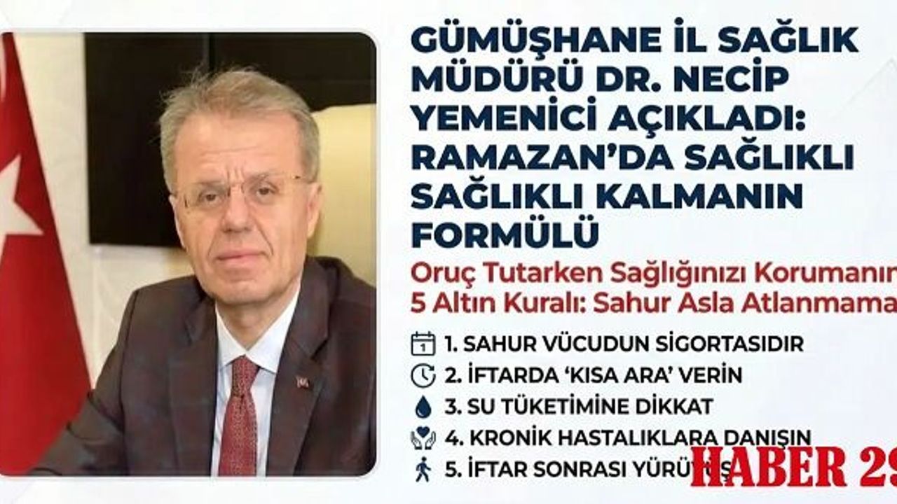 Gümüşhane İl Sağlık Müdürü Dr. Necip Yemenici, on bir ayın sultanı Ramazan’ın gelişiyle birlikte vatandaşların ibadetlerini sağlıklı bir şekilde yerine getirebilmeleri için kritik bir beslenme rehberi yayımladı. Değişen öğün saatlerinin ve uzun süreli açlığın vücut üzerindeki etkilerini en aza indirmeyi hedefleyen açıklamada, sahurdan iftara kadar dikkat edilmesi gereken hayati ipuçları yer alıyor.