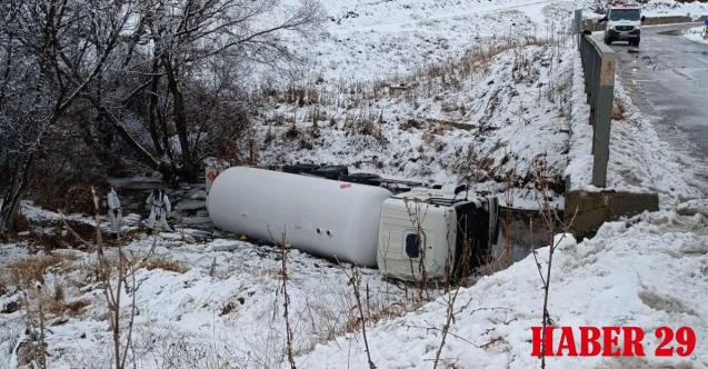 Gümüşhane’nin Kelkit ilçesinde buzlanan yolda kontrolden çıkan LPG yüklü tanker dere yatağına devrildi. AFAD ekiplerinin sızıntı kontrolü yaptığı kazada yaralanan sürücü Şenol K., Kelkit Devlet Hastanesinde tedavi altına alındı.