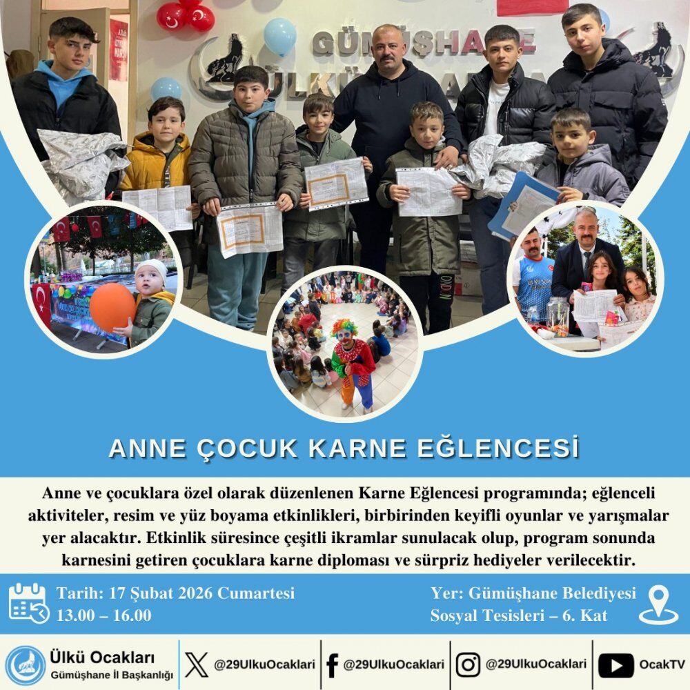 "Yetişen ve yetiştirenin adıdır Ülkü Ocakları" düsturuyla hareket eden Ülkü Ocakları Gümüşhane İl Başkanlığı, 17 Ocak Cumartesi günü Gümüşhane Belediye binasının 6.katında bulunan sosyal tesislerde 13.00-16.00 saatleri arasında kapsamlı bir "Anne-Çocuk Karne Eğlencesi" gerçekleştirecek.