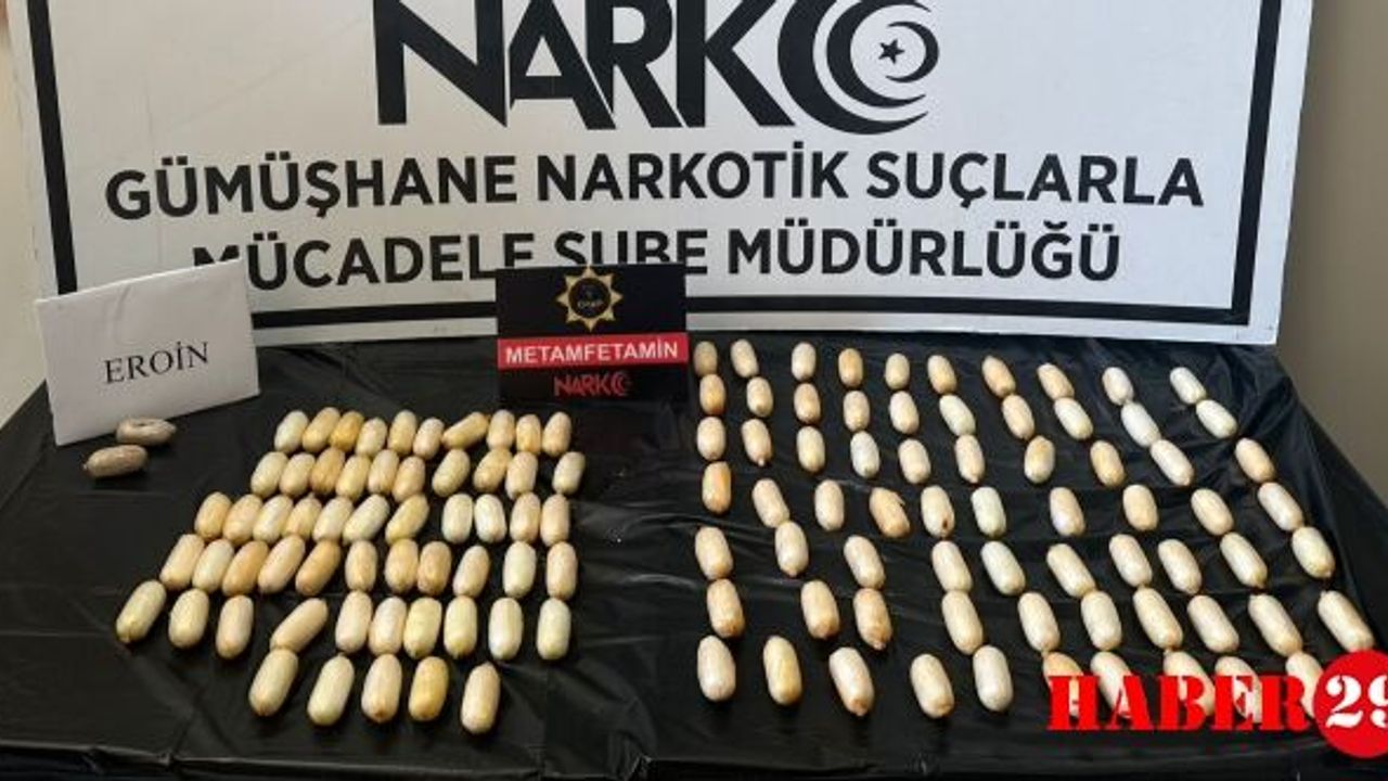 Gümüşhane İl Emniyet Müdürlüğü Narkotik Suçlarla Mücadele Şube Müdürlüğü tarafından gerçekleştirilen başarılı bir operasyonda, İran uyruklu iki şahıs, vücutlarına sakladıkları büyük miktarda metamfetamin ve eroin ile yakalandı.