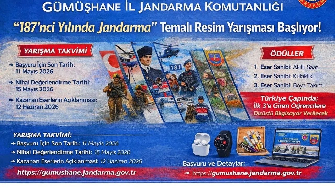 Gümüşhane İl Jandarma Komutanlığı, kuruluşunun 187. yıl dönümünü özel bir resim yarışmasıyla kutluyor. Ortaokul öğrencilerinin jandarma imajını sanatla buluşturacağı yarışmada kazananları teknolojik ödüller bekliyor.