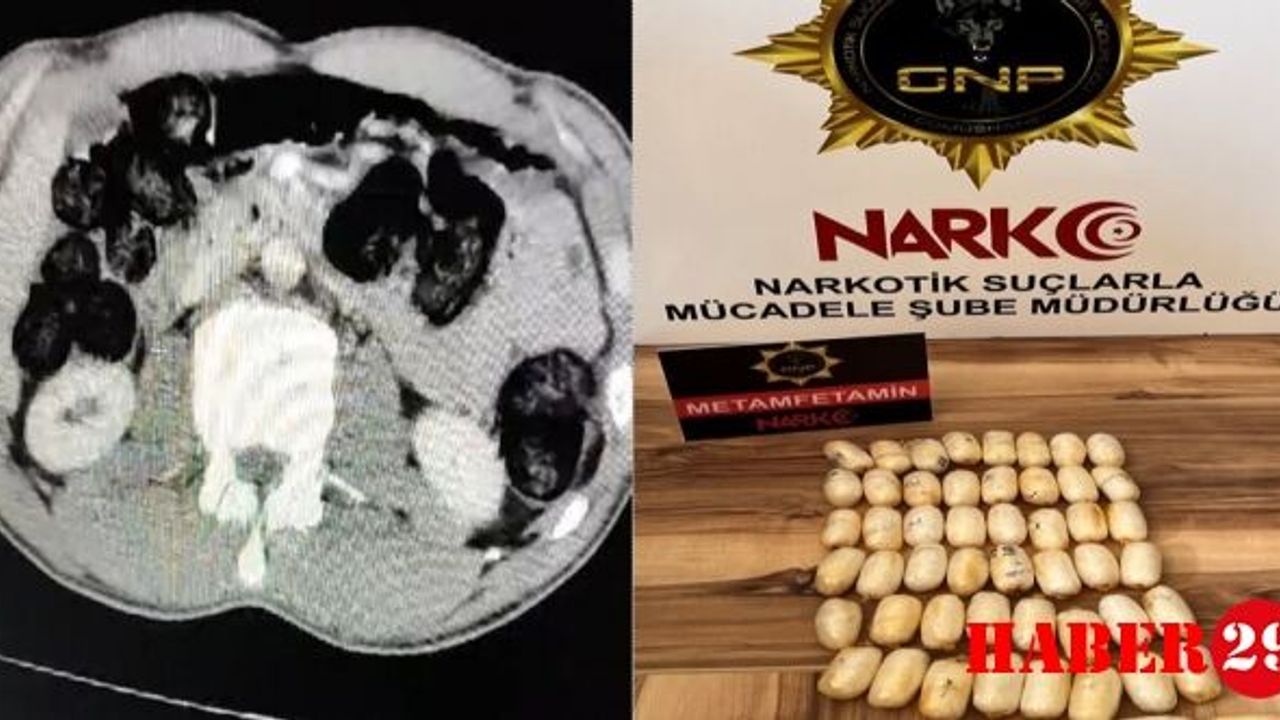 Gümüşhane Cumhuriyet Başsavcılığı'ndan alınan talimatla şahsın Gümüşhane Devlet Hastanesi'nde yapılan kontrollerinde mide ve bağırsaklarında yabancı cisimler olduğu belirlendi. Hastanede yapılan müdahale sonucunda şahsın mide ve bağırsaklarından 53 parça halinde toplam 513,08 gram metamfetamin maddesi ele geçirildi. Ayrıca şahsın üzerinde 3 adet sentetik ecza hap da bulundu.