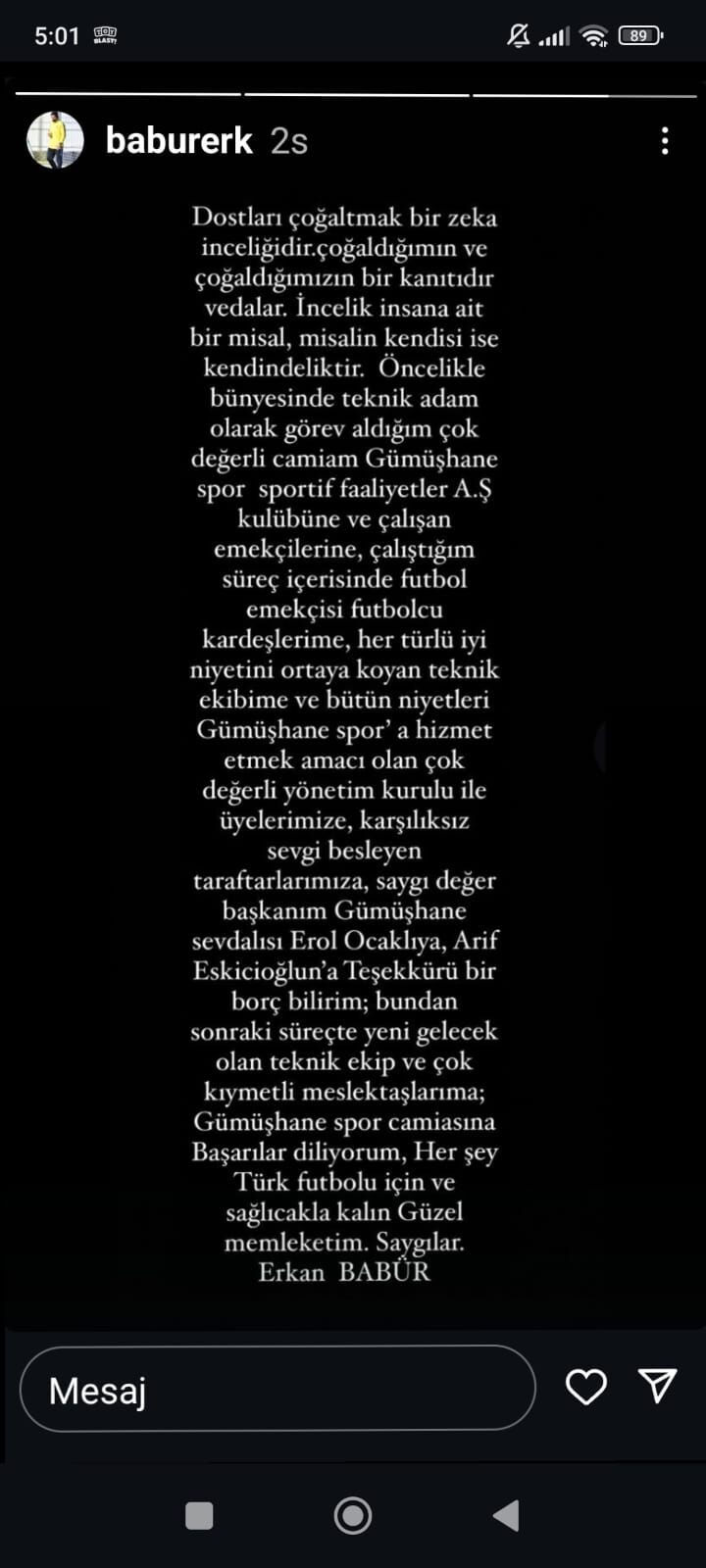 Yeni gelecek teknik ekibe ve Gümüşhanespor camiasına başarılar dileyerek sözlerine son veren Babur, "Her şey Türk futbolu için ve sağlıcakla kalın. Güzel memleketim, saygılar" diyerek veda etti.