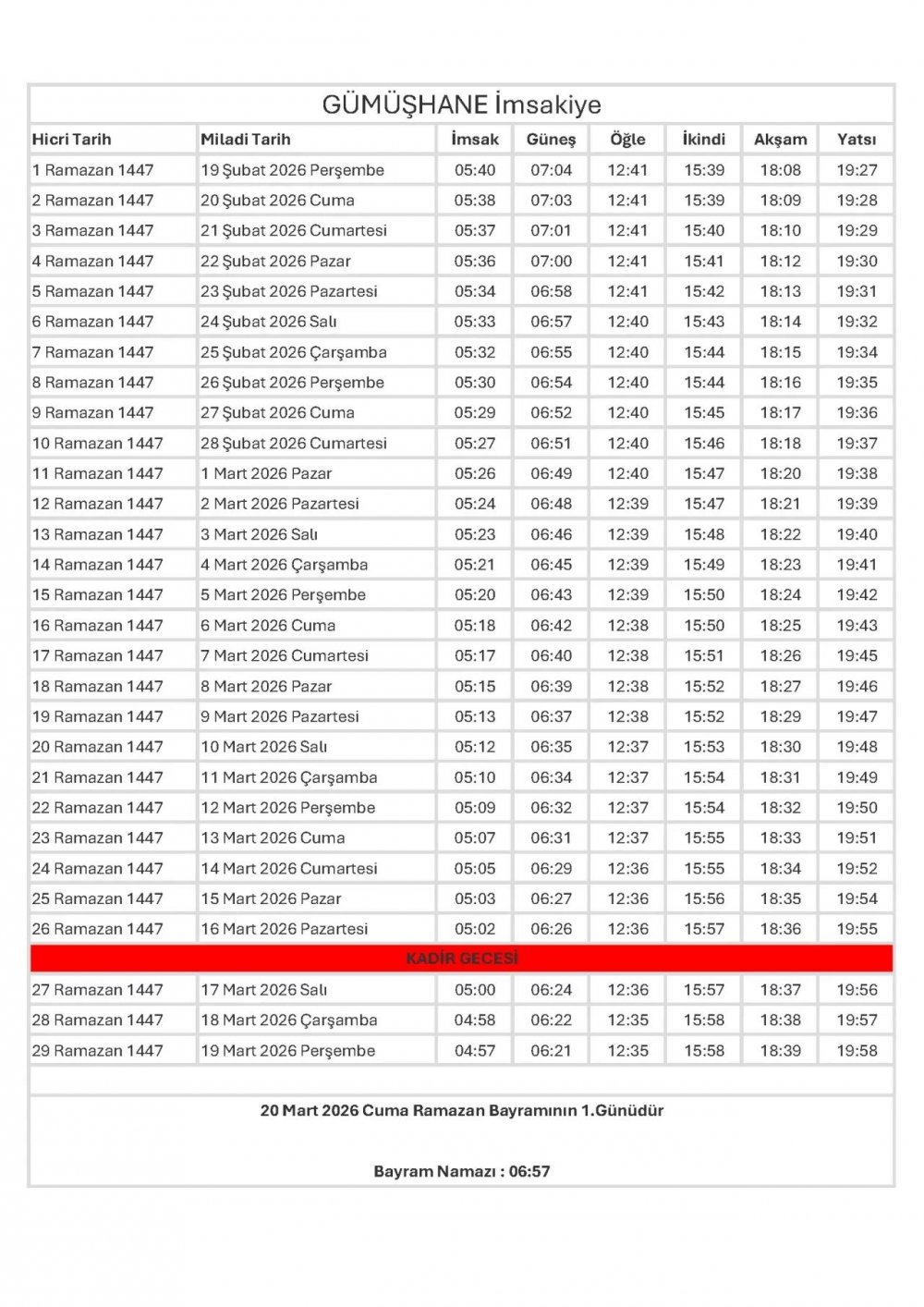 Bayram namazı saatleri; Gümüşhane merkez ve Kelkit ilçesinde 06.57, Köse ilçesinde 06.56, Kürtün, Şiran ve Torul ilçelerinde ise 06.58 olarak açıklandı.