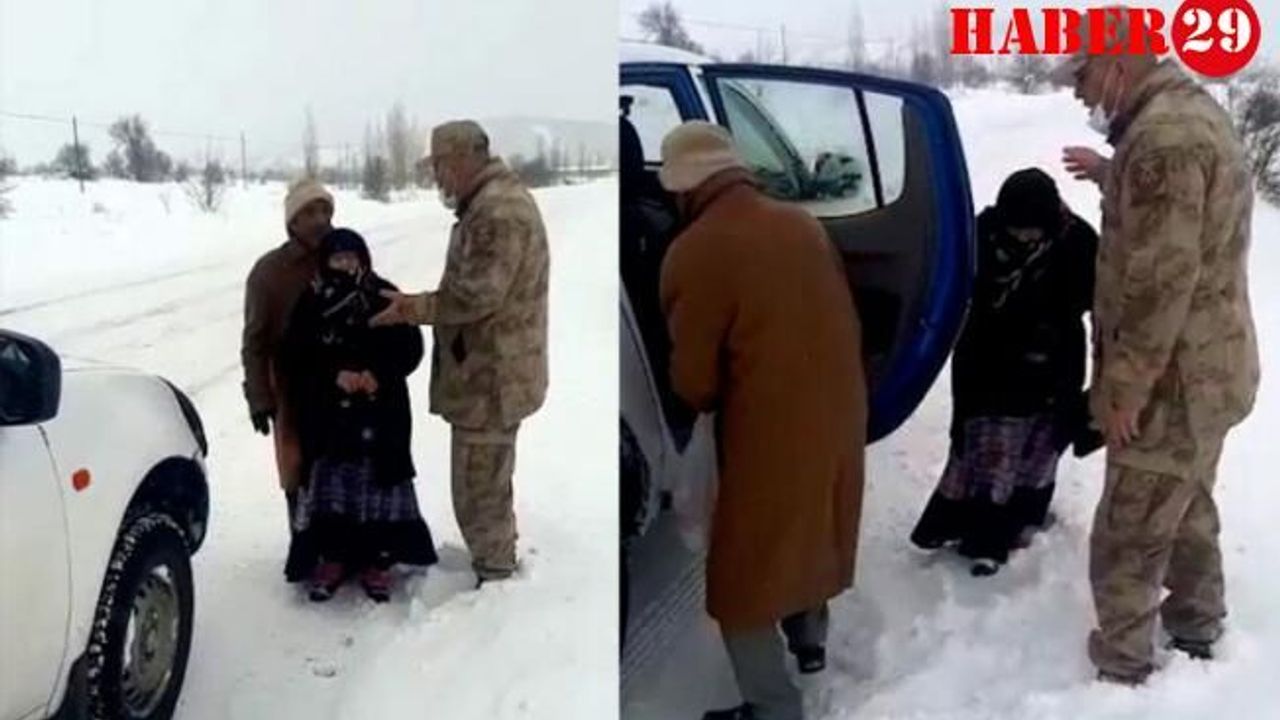 Alınan bilgiye göre ilçe merkezine 5 kilometre uzaklıktaki Sarıca köyünde yaşayan Ahmet ve Halime Sarı çiftine yolda denk gelen Jandarma devriyesi, sorduklarında ilçe merkezine gitmek için yola çıktıklarını öğrendi. Yaşlı çiftin yoğun kar yağışı ve tipide yürüme gitmelerine gönülleri el vermeyen Jandarma ekipleri, Sarı çiftini devriye aracıyla ilçe merkezine kadar götürdü.