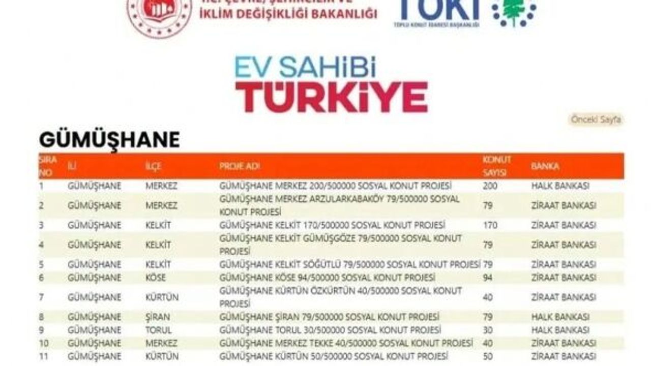 TOKİ'nin 500.000 Sosyal Konut Projesi çerçevesinde Gümüşhane'ye yapılacak 940 konutun ilçe ve beldelere göre dağılımı da netleşti. Paylaşılan resmi listeye göre konut dağılımı şu şekilde: