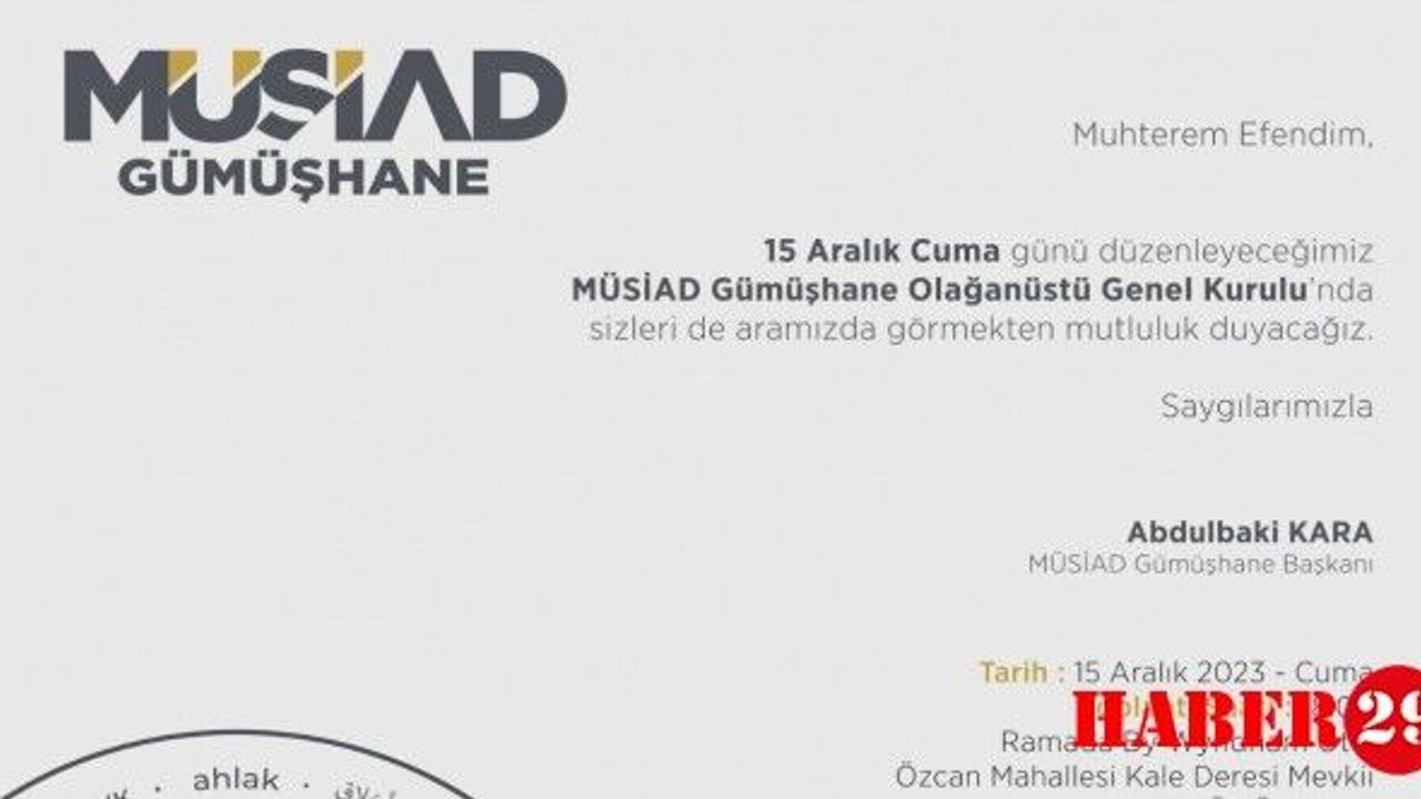 15 Aralık Cuma (yarın) günü saat 18.00'da Ramada Otel'de yapılacak olan genel kurul toplantısında herhangi bir seçim süreci gerçekleştirilmeden sadece başkan değişikliği yapılacak. MÜSİAD Gümüşhane şubesinin yeni başkanının ismi genel kurulda açıklanarak görev devir teslim töreni gerçekleştirilecek.