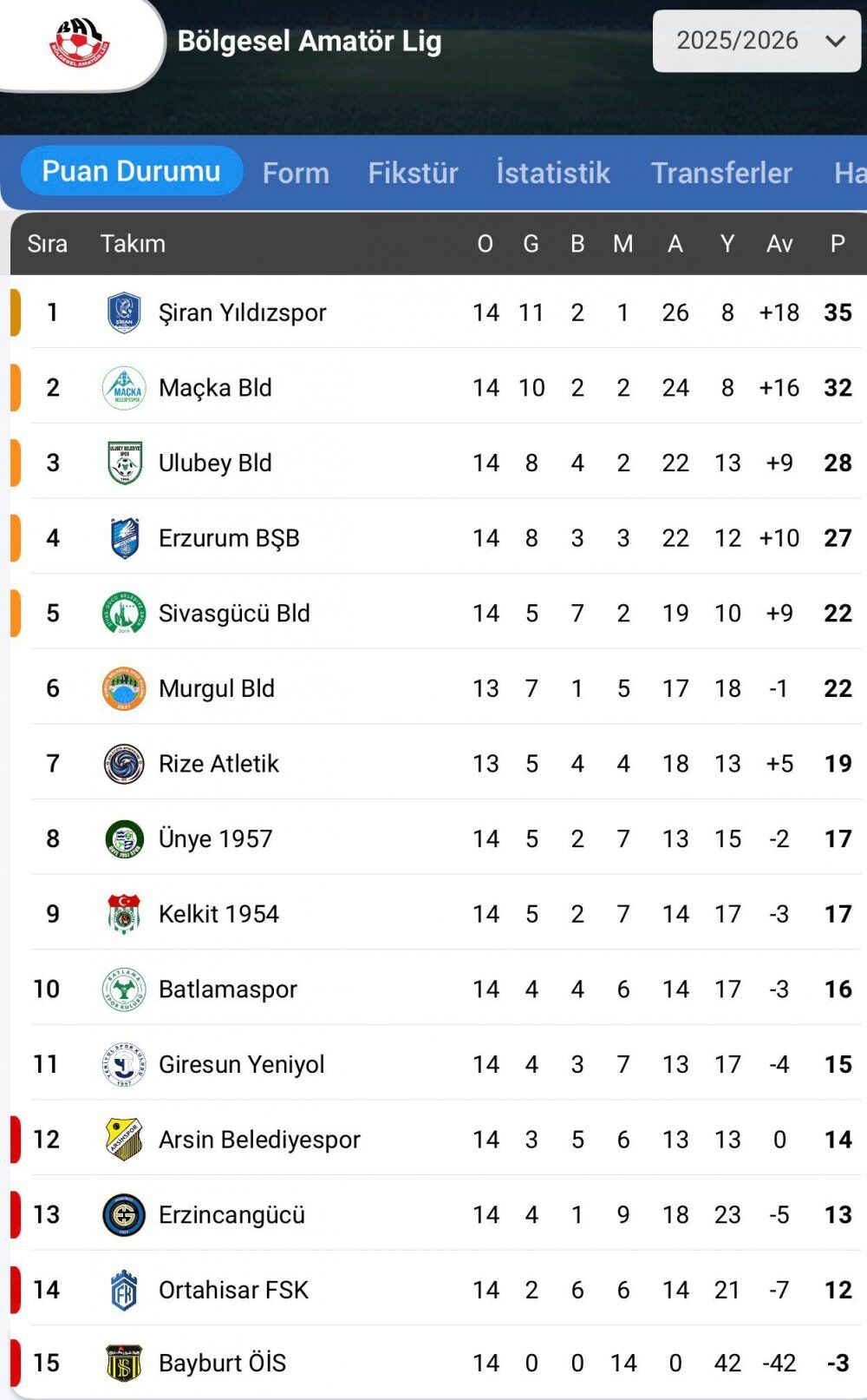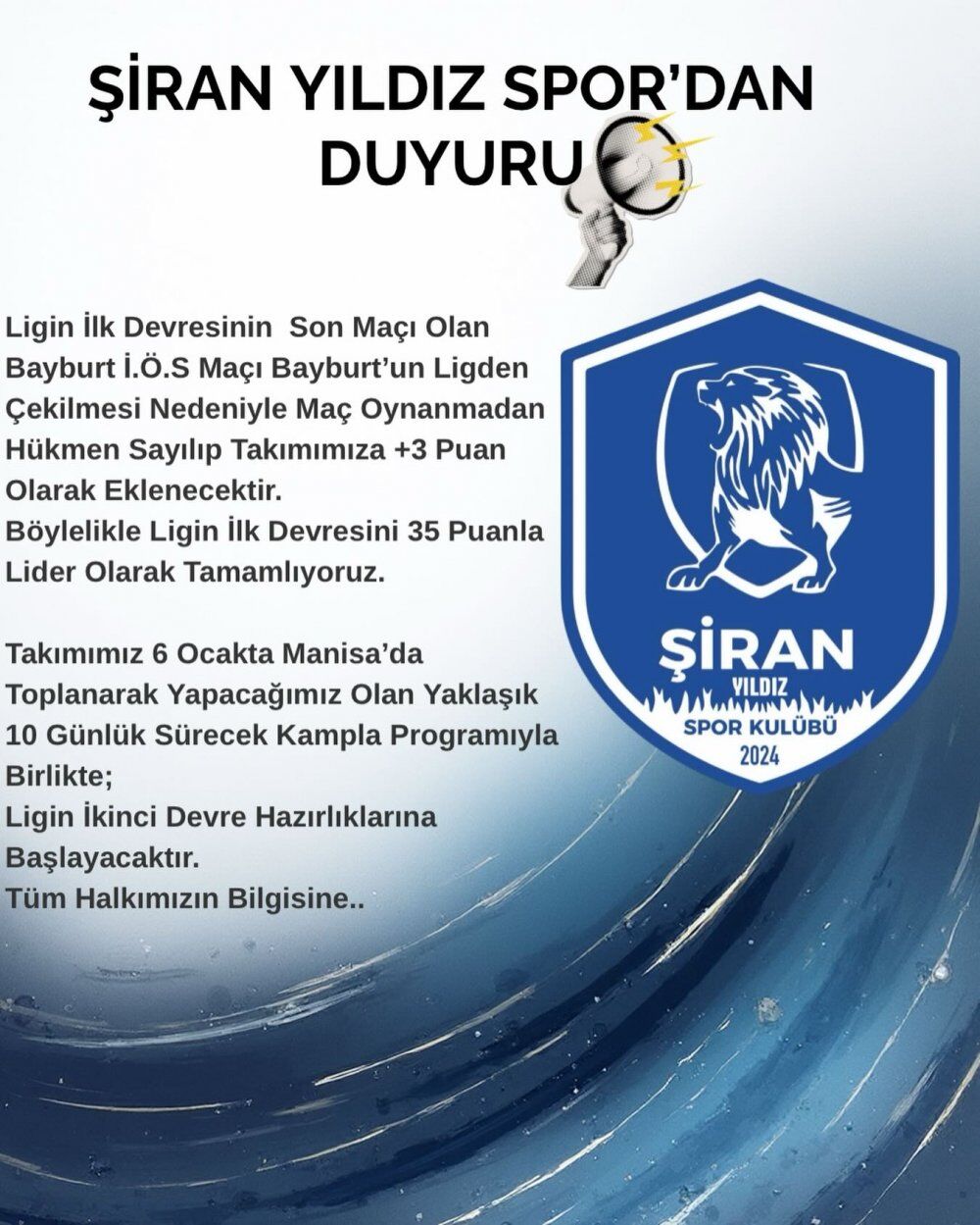 Müsabaka, talimatlar gereği Şiran Yıldızspor’un 3-0 hükmen galibiyetiyle tescil edildi. Bu sonuçla birlikte mavi-beyazlı ekip hanesine +3 puan eklerken, ligin ilk devresini 35 puanla lider olarak tamamlamayı başardı. Sezonun ilk yarısında ortaya koyduğu istikrarlı performansla dikkat çeken Şiran Yıldızspor, aldığı başarılı sonuçlarla rakiplerine üstünlük sağladı. Son hafta karşılaşmasının hükmen galibiyetle sonuçlanması, temsilcimizin liderliğini perçinlerken, ikinci devre öncesinde camiada moralleri yükseltti.