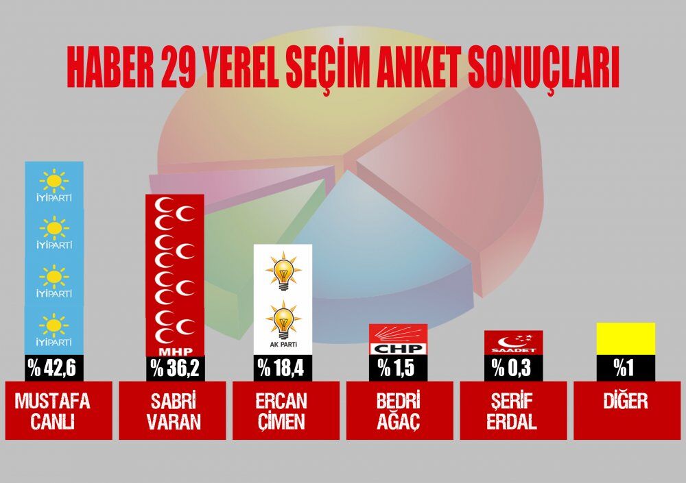 Haber 29 olarak 31 Mart Yerel Seçimleri için hazırladığımız ankette "Yerel Seçimlerde Hangi Partiye Oy Vereceksiniz" diye sorarak cevaplamalarını istedik. 29 Mart gününe kadar anketimizde toplam 10 bin 372 kişi oy kullandı. Ankete katılan ziyaretçilerimiz %42,6'sı İYİ Parti, %36,2'si MHP, %18,4'ü AK Parti, %1,5'i CHP, %0,3'ü Saadet Partisi ve %1'i diğer partilere oy verecek. Seçime kadar devam edecek ankete katılmak için tıklayın.