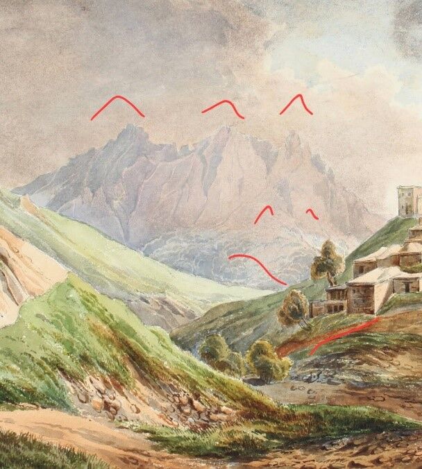 Kafamızı karıştıran bu kayalık görünümü, dar açıyla baktığınızda bir zirve değil aslında. Ressam dere içinden yukarı doğru bakarak resmi çizdiği için kayalıklar karşımıza sanki bir zirve imiş gibi gözükmüştür (Bunu tespit etmek bir hayli zamanımızı almıştır). Günümüz haliyle köy arazisi ve ressamın bulunduğu nokta sağ taraftaki fotoğrafta tespit edilmeye çalışılmıştır.